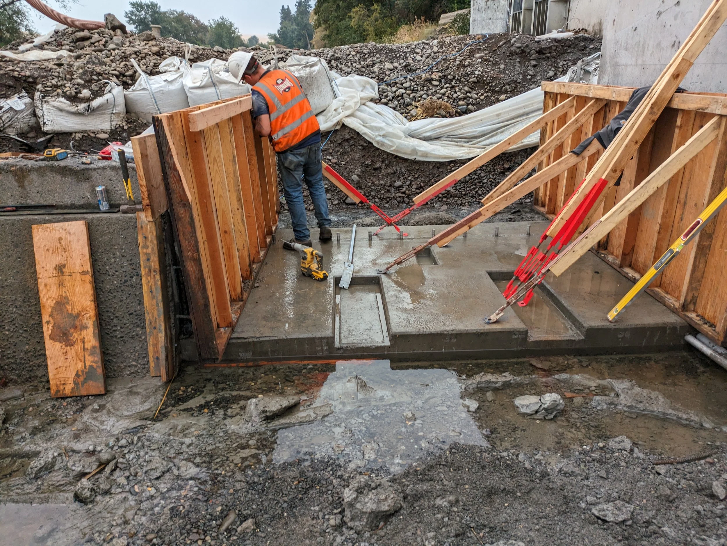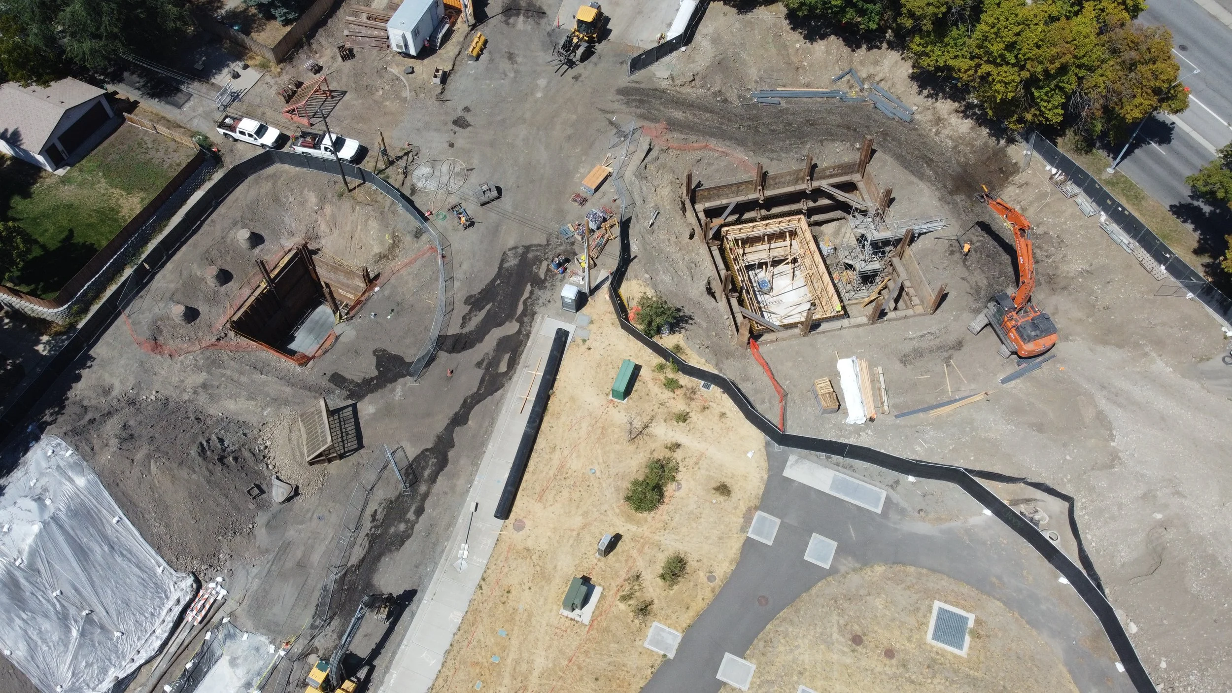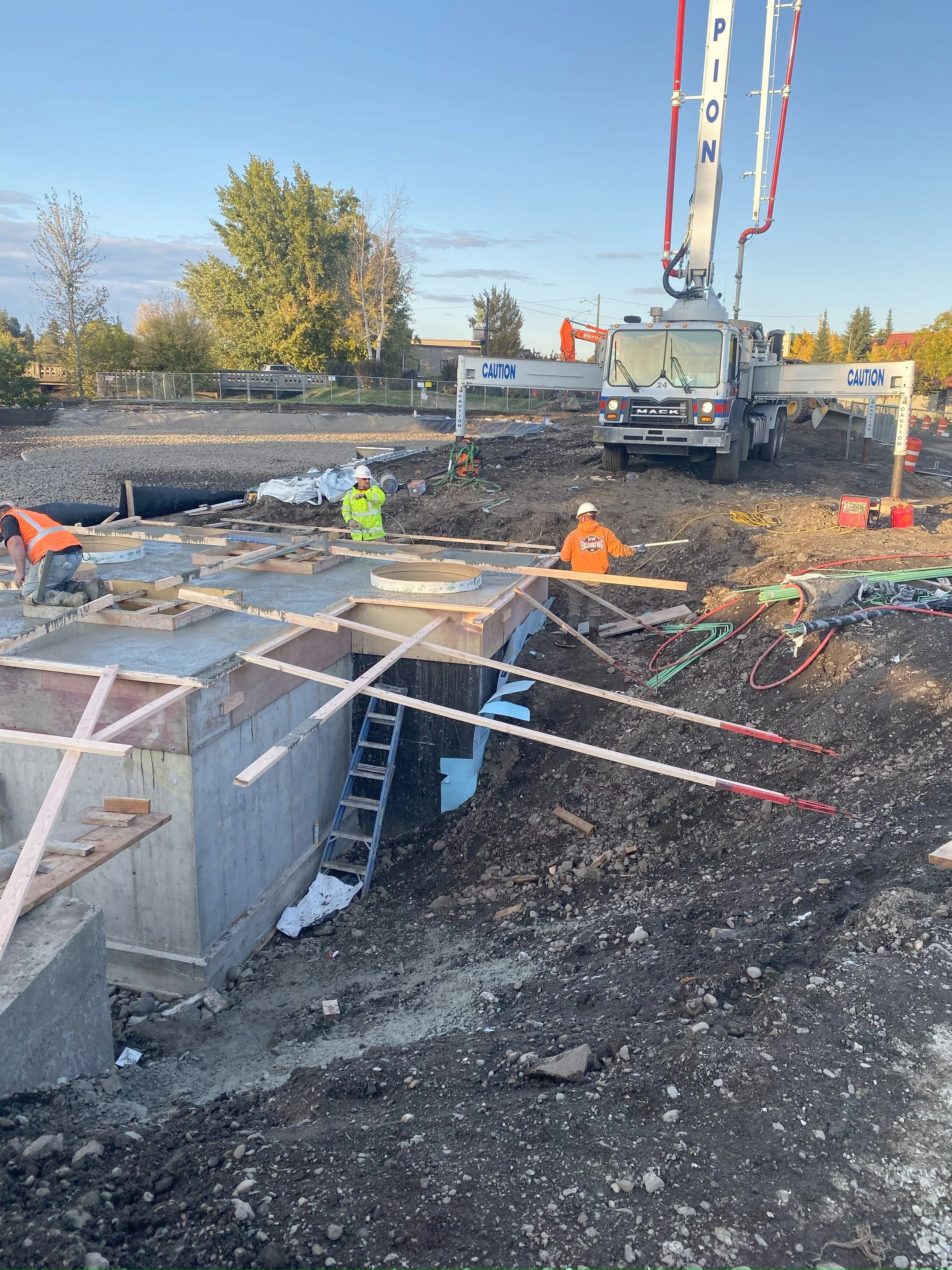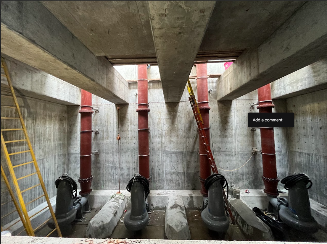 Construction of a below grade concrete cast in place flow control structure. A below grade cast in place capacity stormwater pump station, with electrical facilities, including submersible stormwater pumps, motor controls, and force main piping.