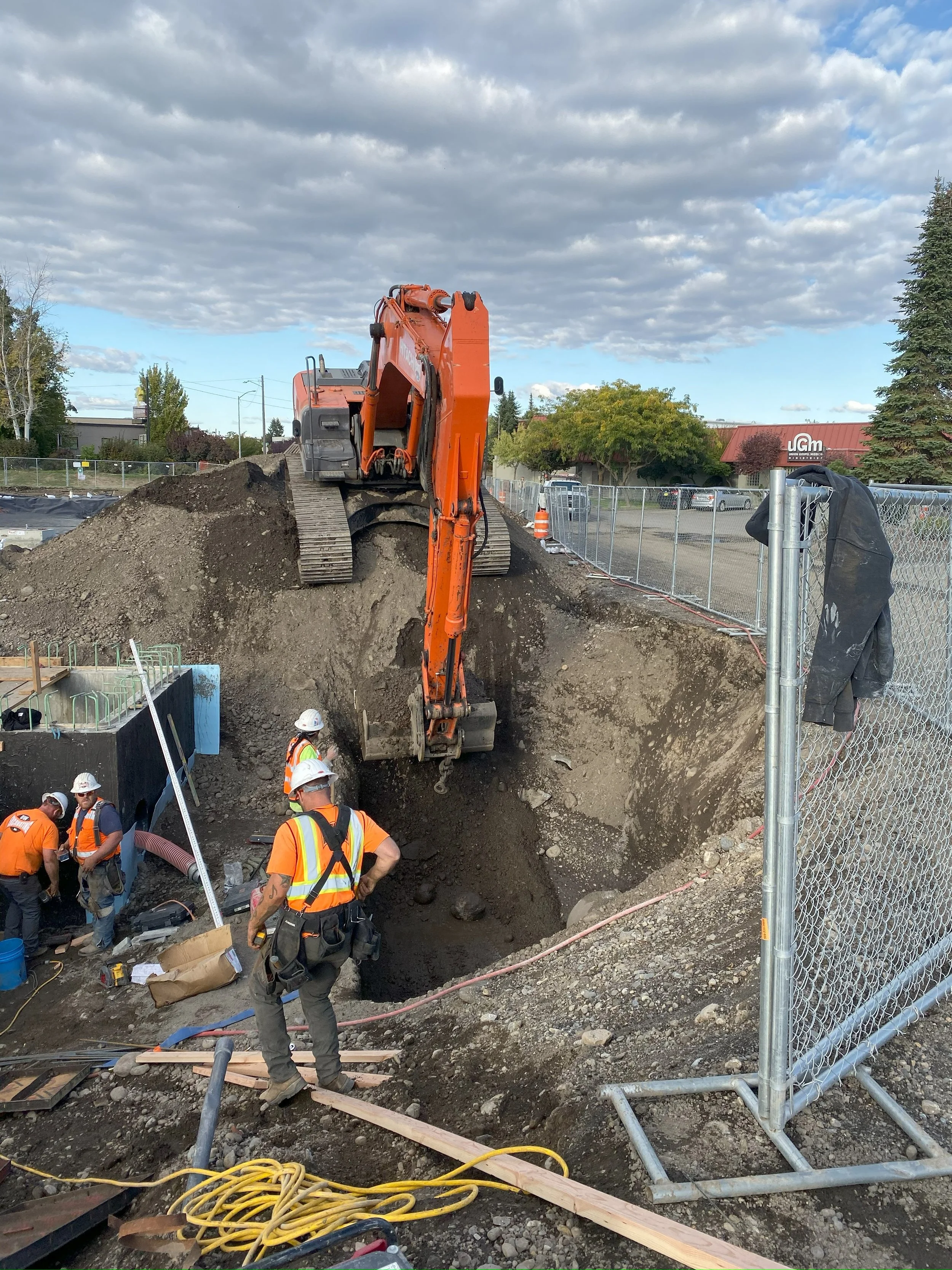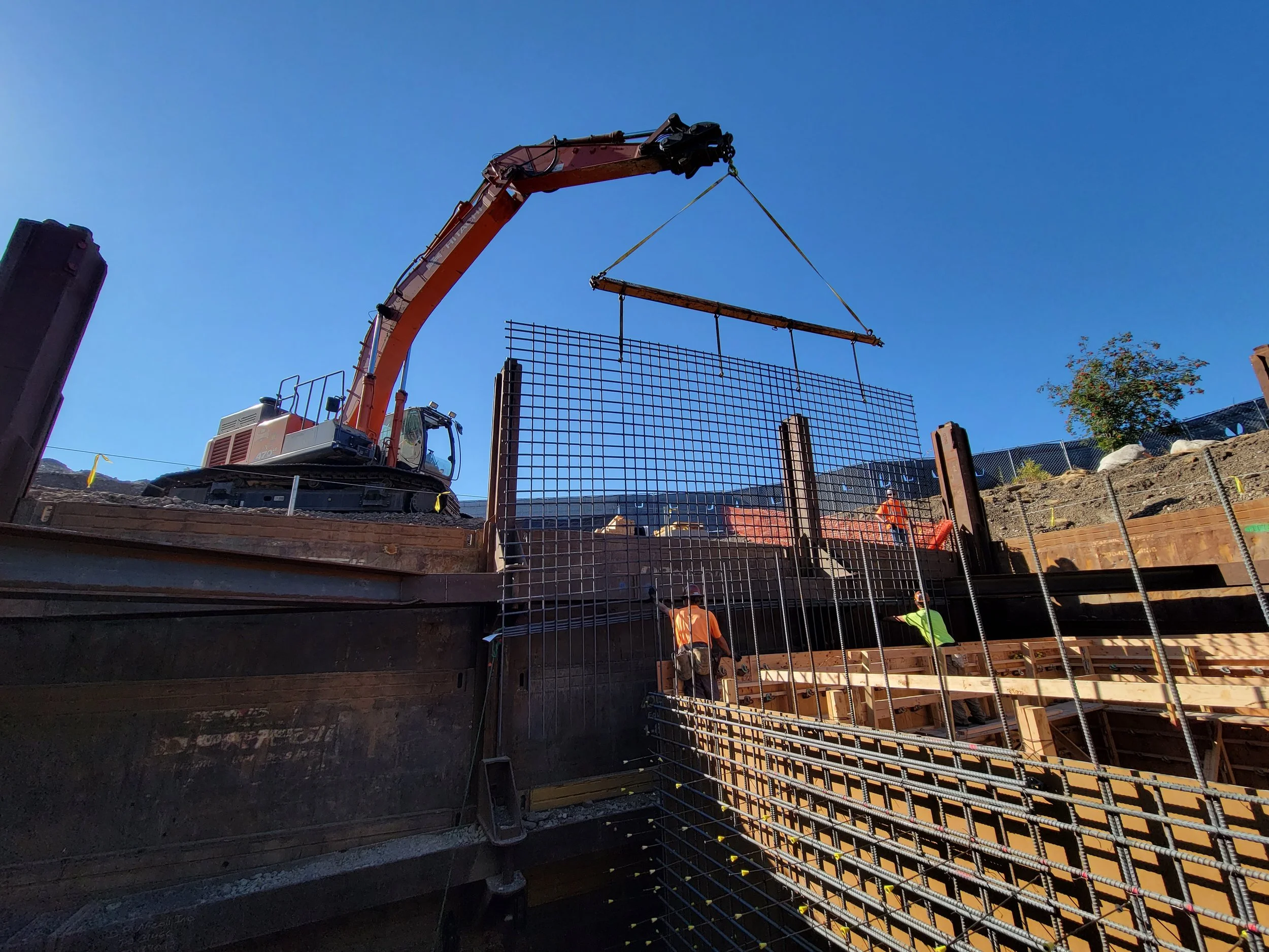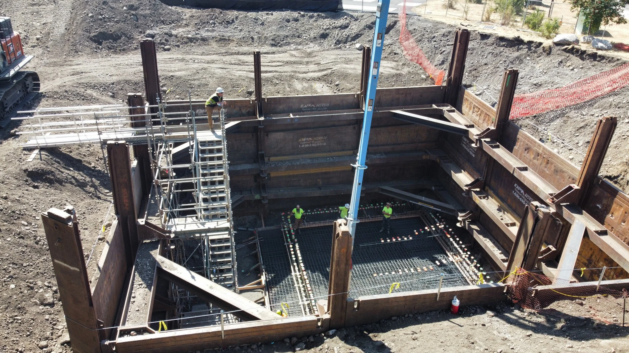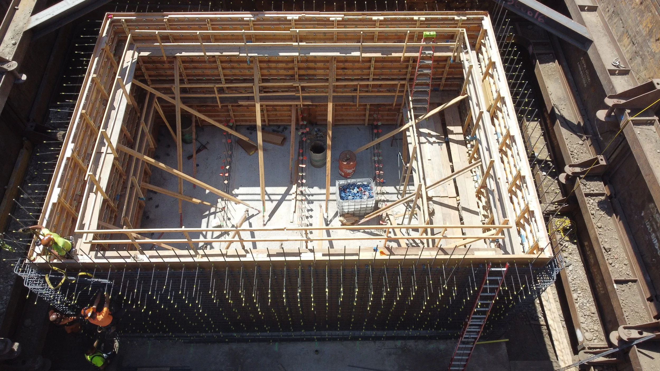 Construction of a below grade concrete cast in place flow control structure. A below grade cast in place capacity stormwater pump station, with electrical facilities, including submersible stormwater pumps, motor controls, and force main piping.