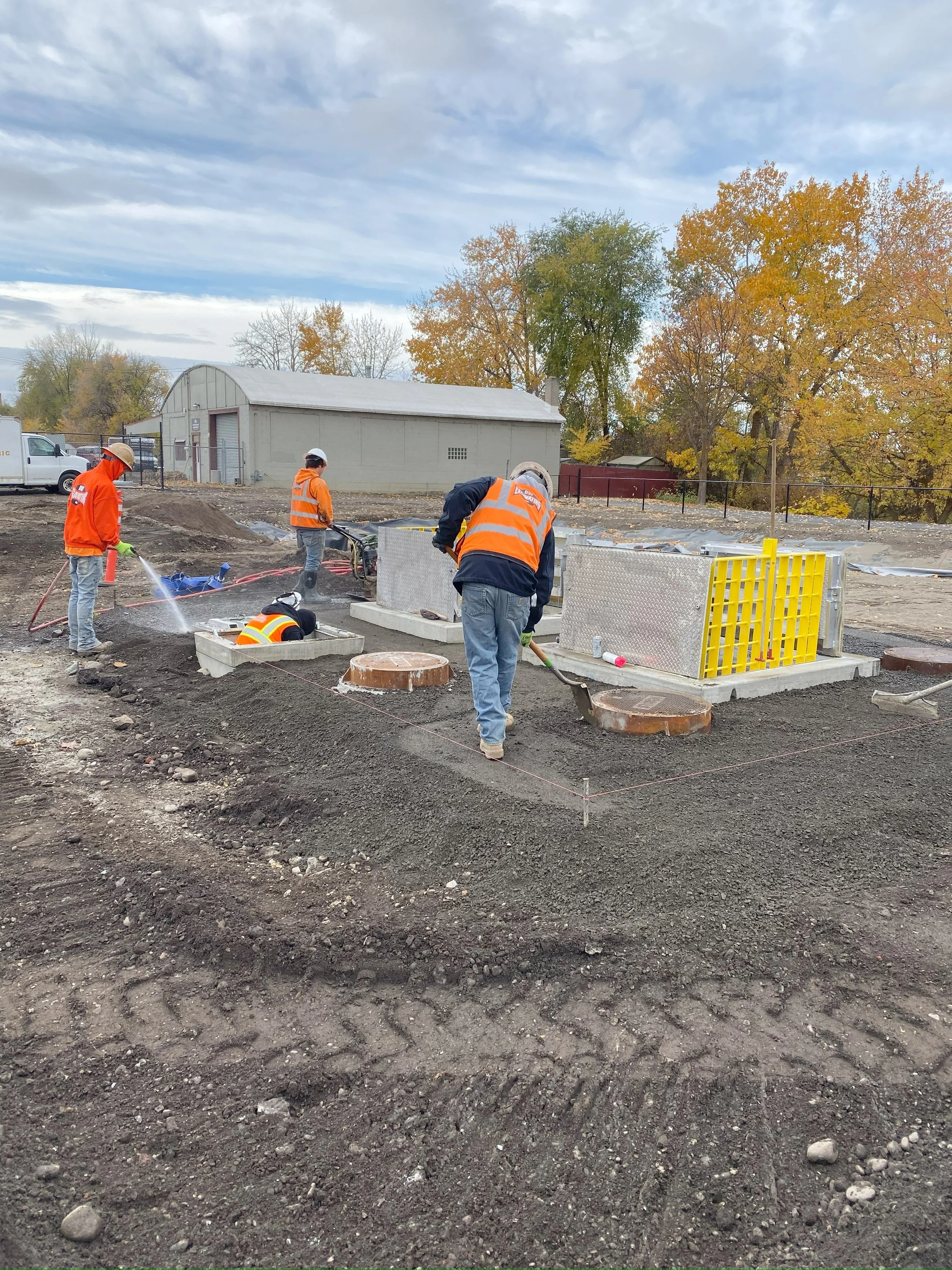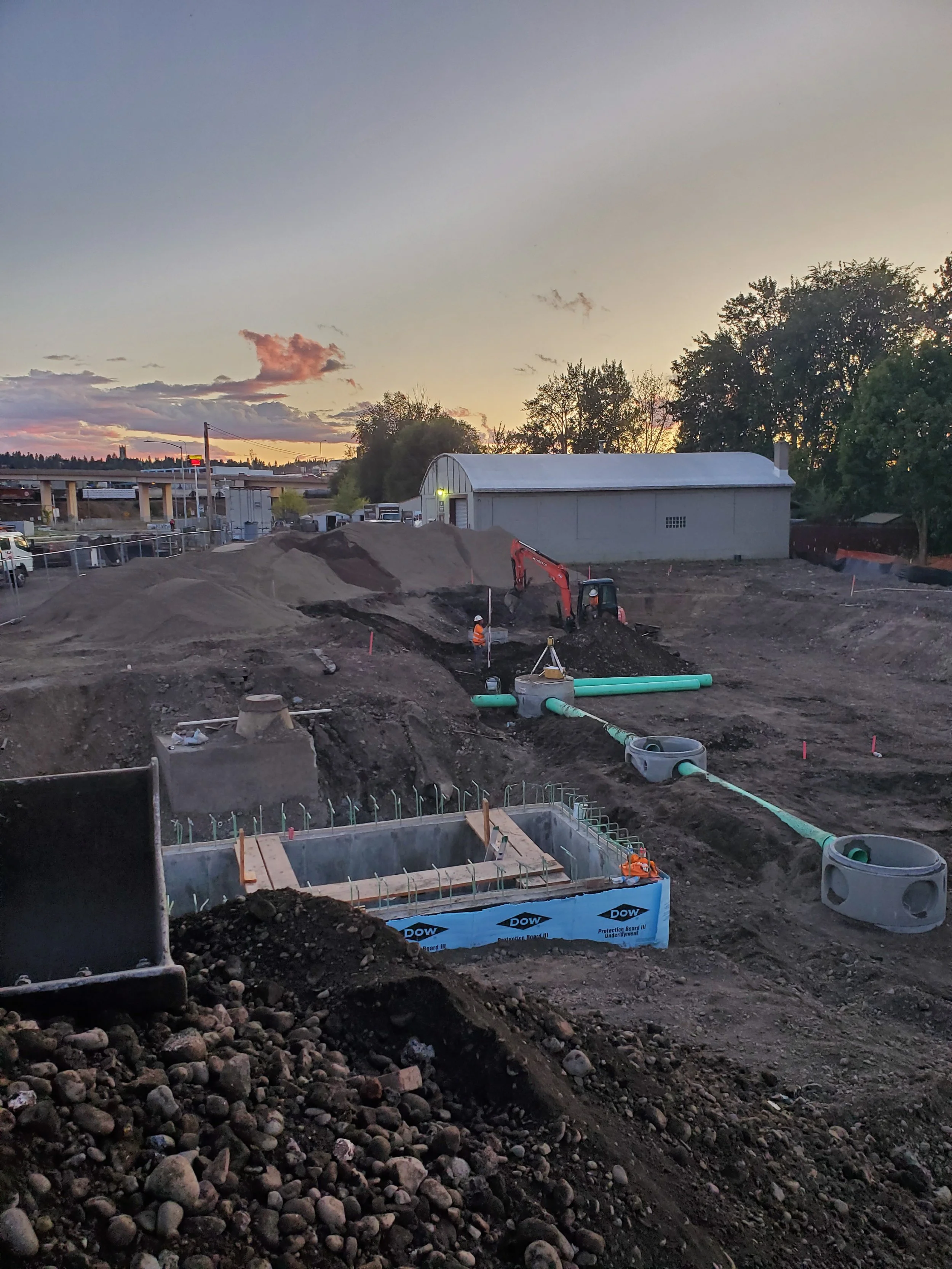 Excavation and embankment, 6” water main, 8” to 72” storm sewer, drainage structures, geomembrane lined bioinfiltration swale, stormwater duplex lift station with control, asphalt pavement, sundry utility adjustments, contaminated soil remediation.