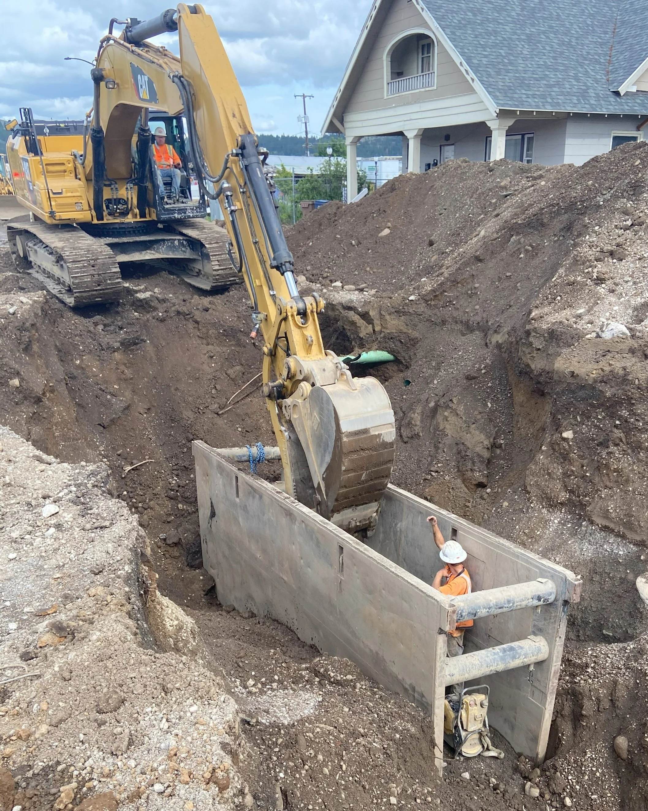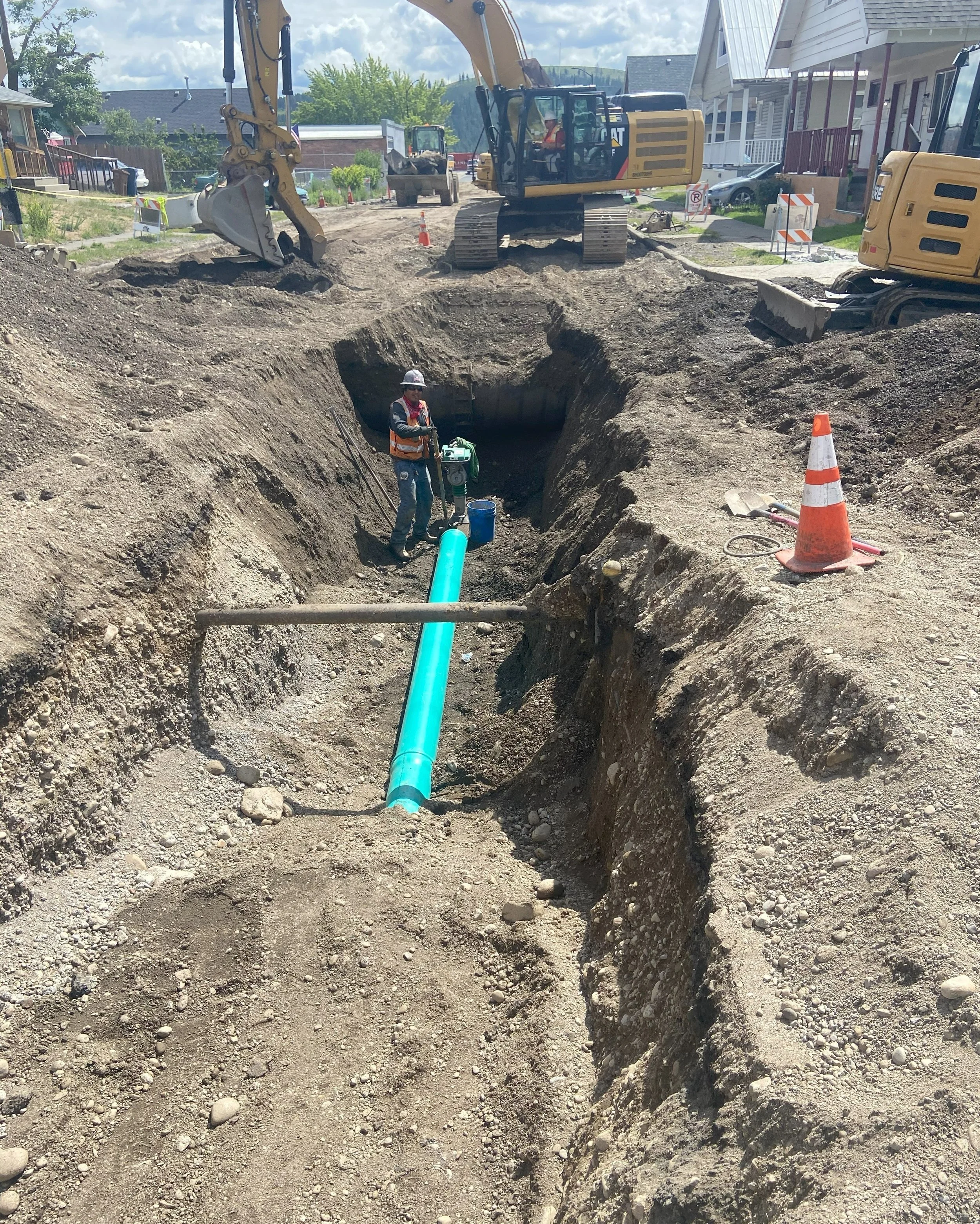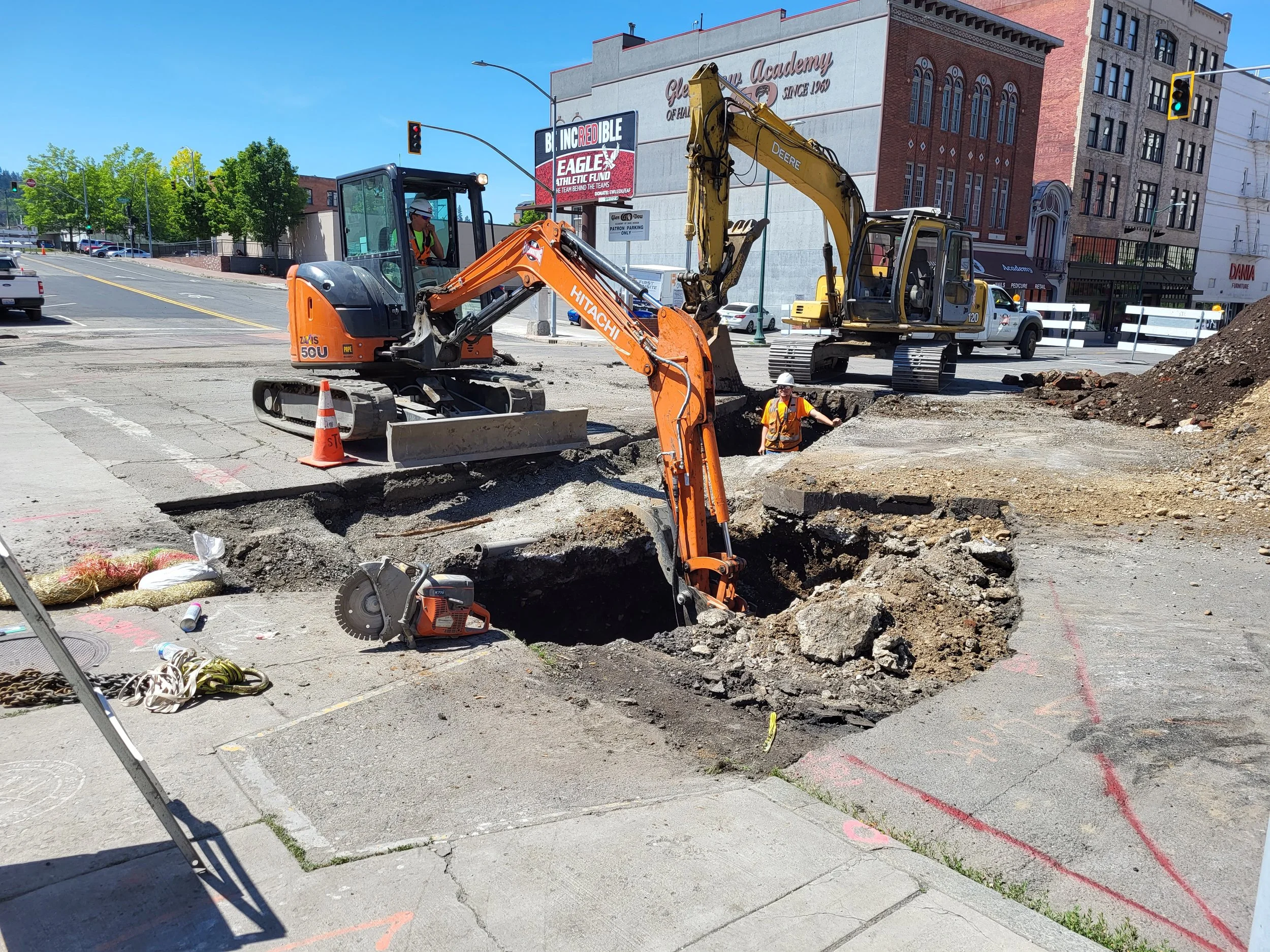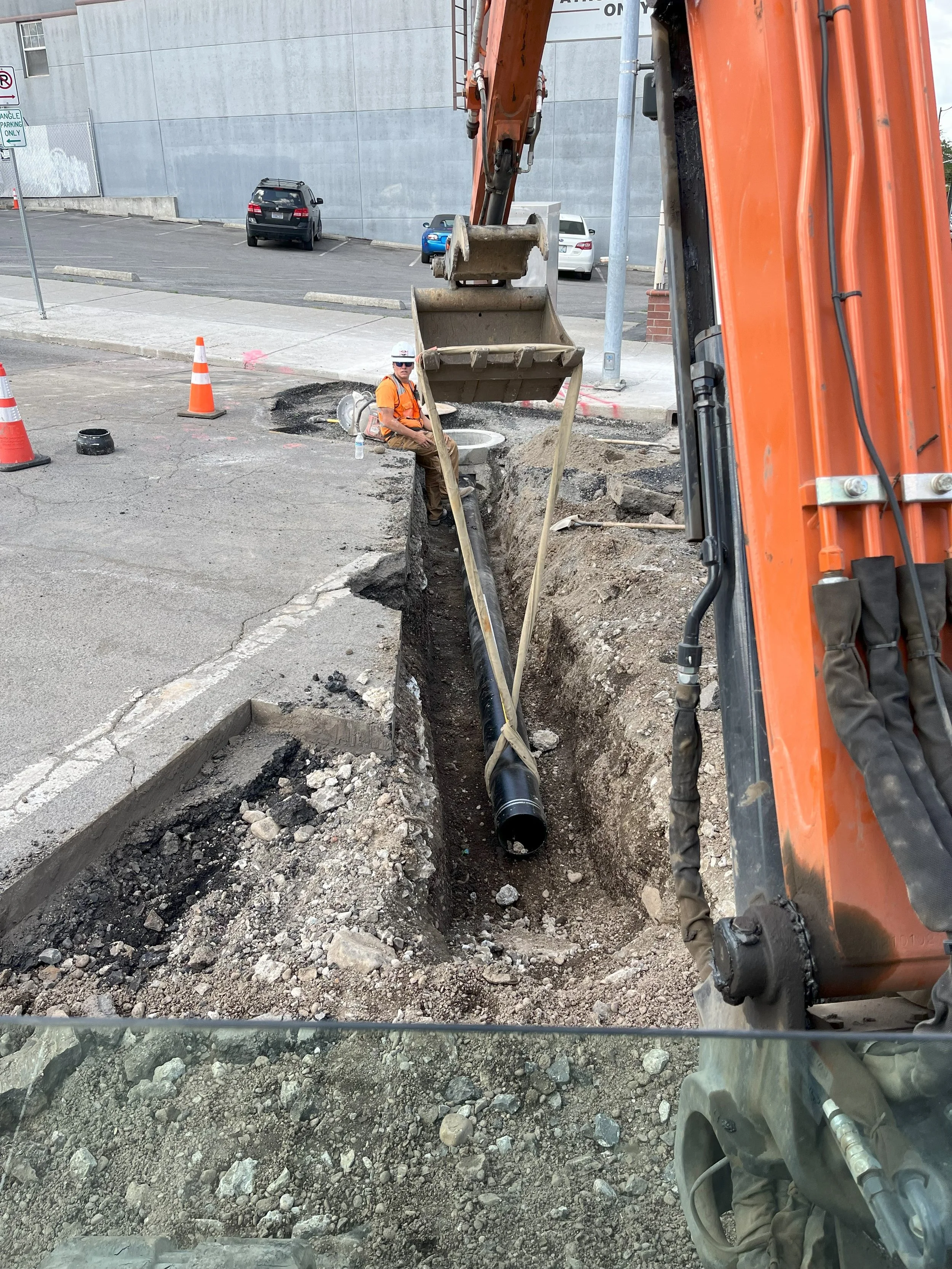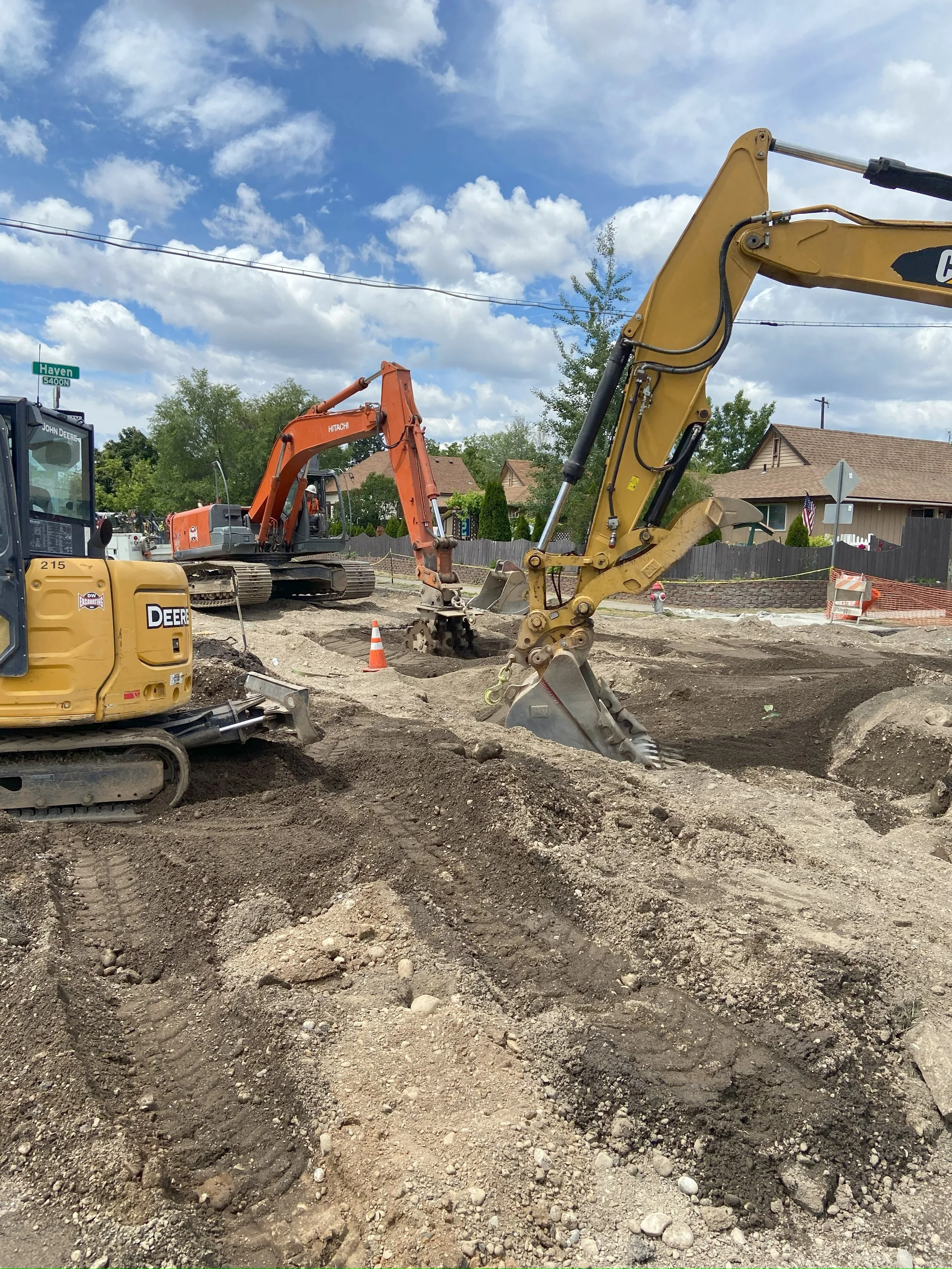 Construction of steel casing, ductile iron force main, water main, sanitary sewer main, storm sewer, and HMA pavement.